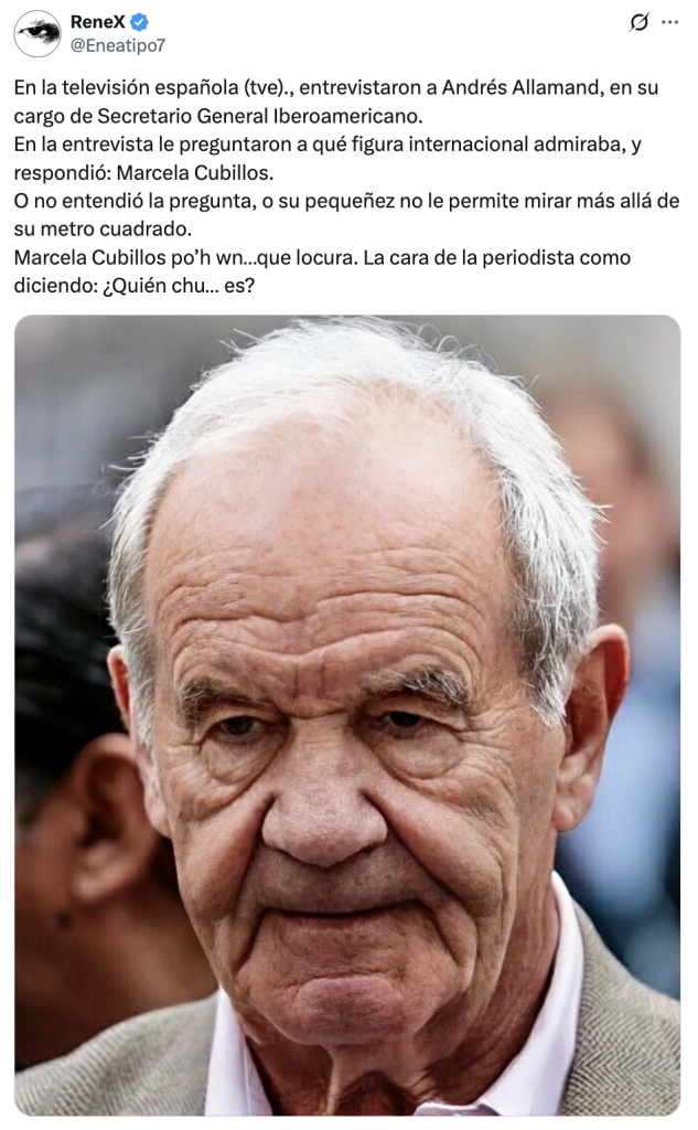 Fast Check CL califica el contenido como #Engañoso. Si bien es correcto que el exministro Allamand respondió que ha «aprendido mucho» de Marcela Cubillos —su esposa—, la pregunta no apuntaba a figuras internacionales que admirara, sino a personas que lo habían marcado personalmente. Además, el contenido viral tergiversa el contexto: la entrevista fue realizada por un periodista hombre, y no por una mujer.