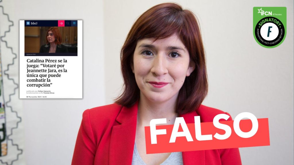 Fast Check CL califica como #Falso el supuesto respaldo público de Catalina Pérez a Jeannette Jara. No existen registros que acrediten la frase atribuida a la diputada ni evidencia de que haya sido publicada por Radio Biobío. Además, desde el equipo de Pérez lo desmintieron, asegurando que ella «no ha dado entrevistas ni declaraciones a ningún medio» sobre este tema.