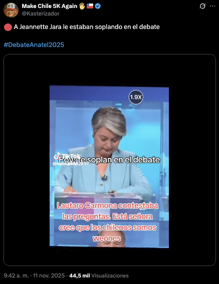 Tras ello, se viralizó en redes sociales (1,2,3,4) que a la candidata oficialista, Jeannette Jara (PC) «le estaban soplando en el debate». Esto, porque en algunos momentos, se le ve anotando en un papel luego de observar su reloj, como si le estuvieran llegando mensajes.