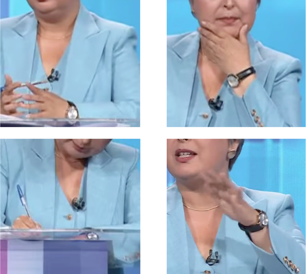 Lo más evidente es que la zona circular es metálica y homogénea, no con botones o una pantalla digital. Además, dependiendo del ángulo, el metal brilla de distinta forma. El borde y la correa del reloj también parecen ser de uno análogo y tradicional, no de un smartwatch. A continuación se pueden ver capturas tomadas a lo largo del debate donde se evidencia el tipo de reloj utilizado por Jara: