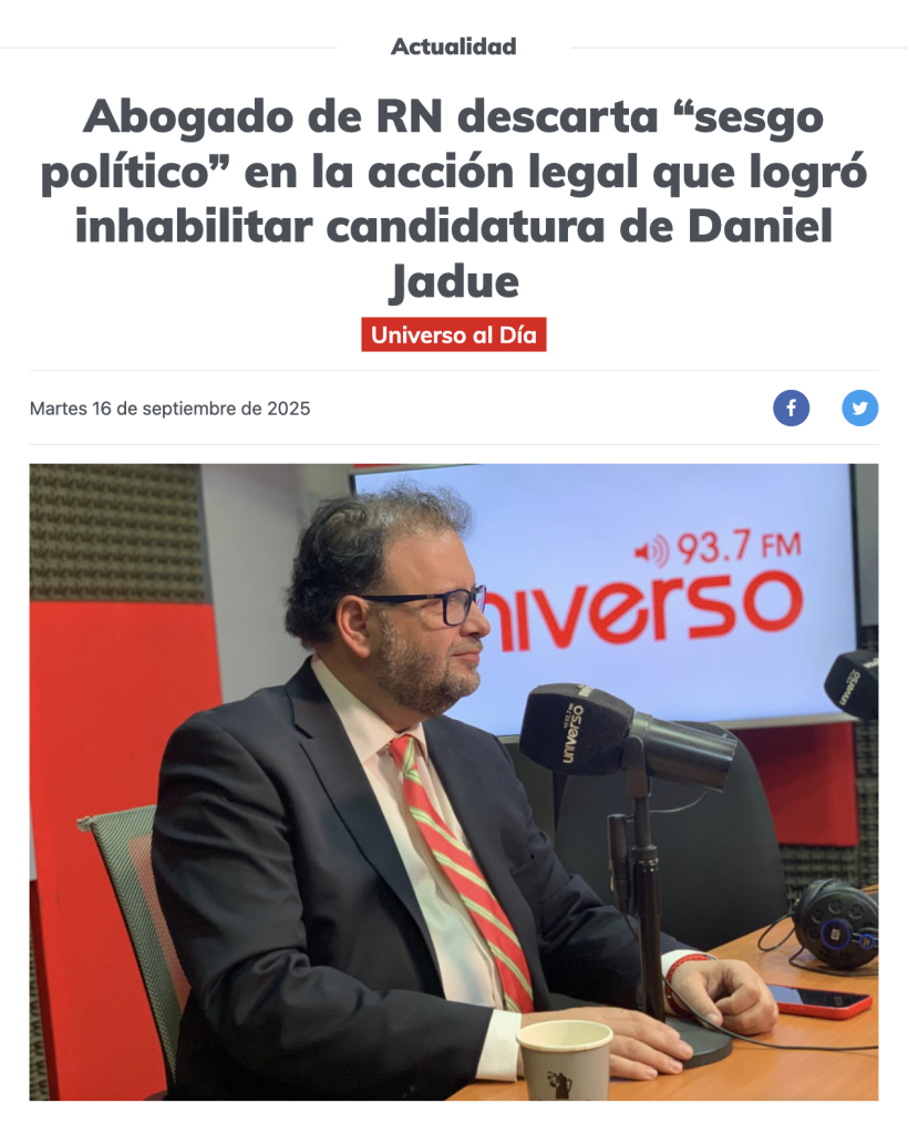 - Entrevista en Universo: “Abogado de RN descarta “sesgo político” en la acción legal que logró inhabilitar candidatura de Daniel Jadue”