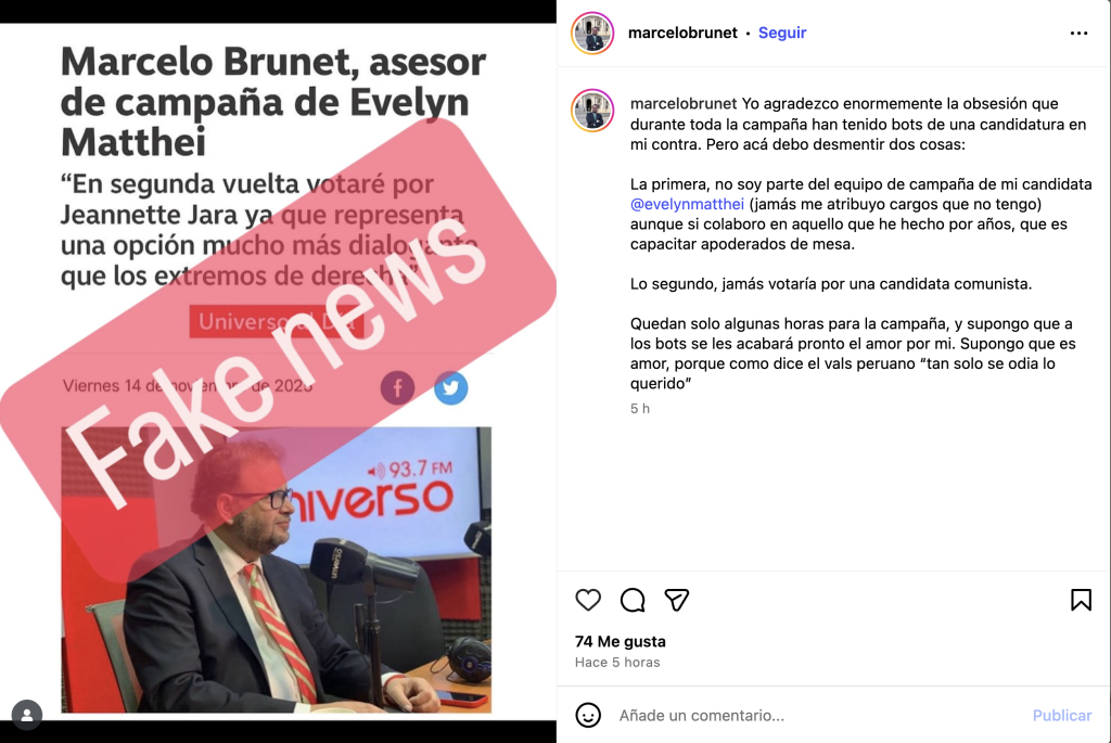 El contenido suma más de 15 mil visualizaciones en la red social. Sin embargo, Fast Check califica el contenido como #Engañoso. Si bien la nota de Universo sobre Brunet es real, esta fue alterada y en ella no hay mención a un respaldo de Jeannette Jara. Por su parte, el propio Brunet desmintió este apoyo y formar parte del comando de Evelyn Matthei.
