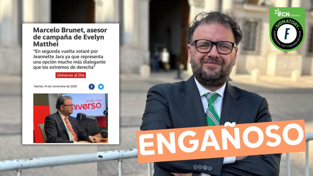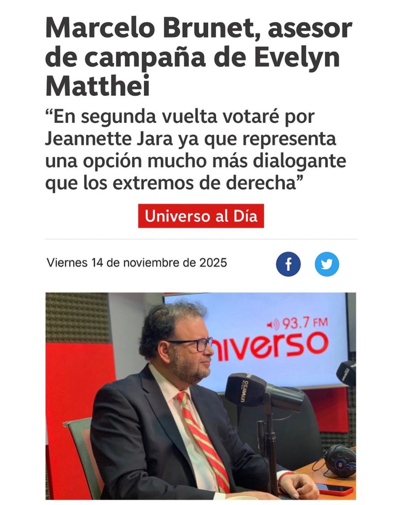 Fast Check CL califica este contenido como #Engañoso. Si bien la nota sobre una entrevista a Marcelo Brunet en Radio Universo existe, la imagen que expone la publicación fue alterada en su titular. Además, la entrevista no contiene ningún apoyo explícito de Brunet a Jeannette Jara. El propio abogado lo desmintió en sus redes y en diálogo con este medio, añadiendo que él no asesora al comando de Evelyn Matthei.
