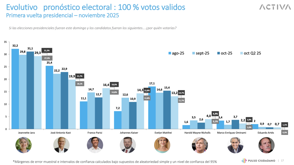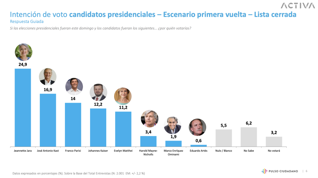 El orden de las preferencias presidenciales es de Johannes Kaiser (33,8%), seguido por José Antonio Kast (17,3%) y Evelyn Matthei (16,8%), todos candidatos de derecha. En el cuarto lugar, aparece la candidata oficialista, Jeannette Jara (8,9%).