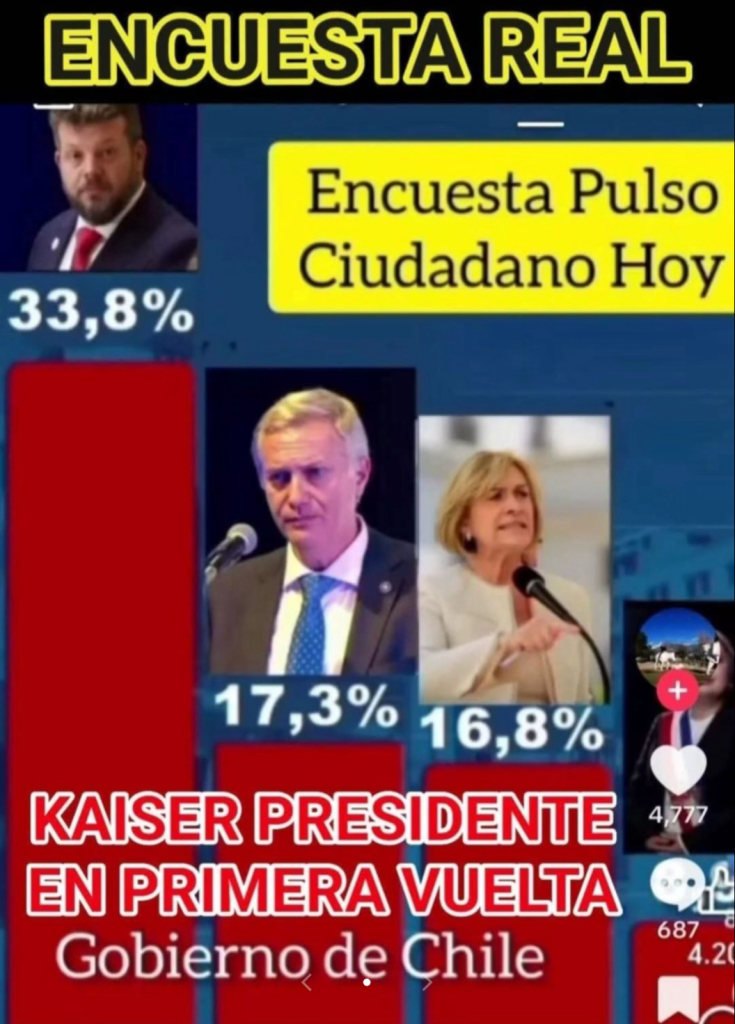 En Tik Tok se viralizó que el candidato presidencial, Johannes Kaiser, tendría 33,8% de apoyo en la encuesta Pulso Ciudadano. Sin embargo, Fast Check CL califica este contenido como #Falso. En la última entrega del sondeo, el candidato del Partido Nacional Libertario no muestra ese nivel de respaldo en opciones de voto y la imagen ha circulado con anterioridad.