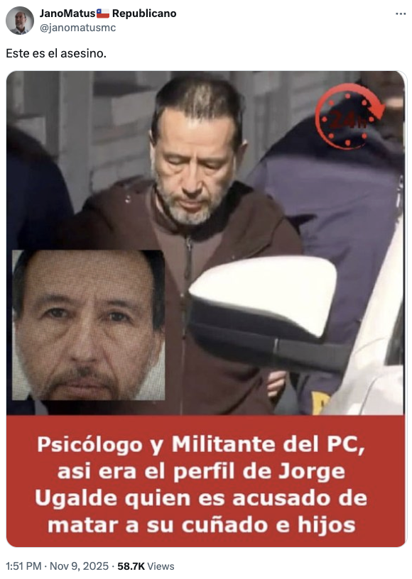 Días después de la detención, se viralizó en X (1,2,3,4) que Jorge Ugalde sería militante del Partido Comunista (PC). La información se intenta hacer pasar por una gráfica de 24 Horas. En la imagen se lee:
