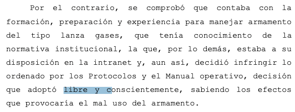 Esto último refutó otro de los argumentos de la defensa de Maturana, pues manifestaron que «la carabina lanza gases es un arma de fuego inidónea para hacer puntería y lesionar». En la sentencia, no obstante, quedó estipulado que: