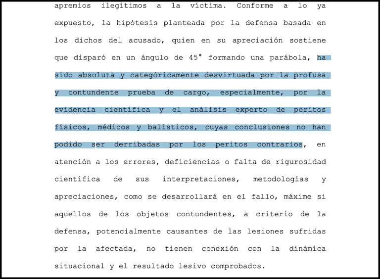 Sin embargo, los estudios aludidos en la sentencia del caso, determinaron que el disparo se hizo en un ángulo bastante inferior.