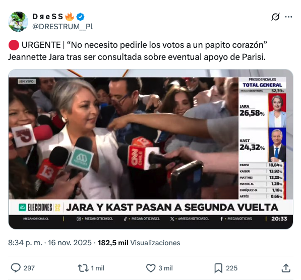 Según la publicación viral, Jara habría aseverado: «No necesito pedirle los votos a un papito corazón», consultada directamente por un eventual apoyo de Parisi.