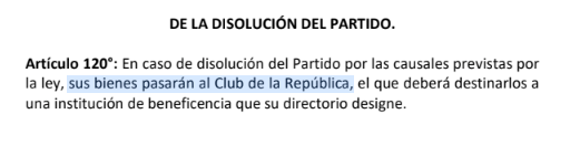 En específico, el artículo 120° plantea que «en caso de disolución del Partido por las causales previstas por la ley, sus bienes pasarán al Club de la República». Esta última es la Corporación Club de la República, persona jurídica de derecho privado sin fines de lucro, encargada de velar por los intereses patrimoniales de la Gran Logia de Chile.