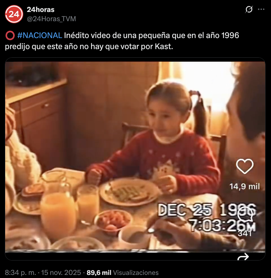 La imagen muestra a una niña comiendo junto a su padre y su madre y, en un momento, la menor dice: «No voten por Kast en 2025». Uno de los posteos señala en su descripción: «Inédito video de una pequeña que en el año 1996 predijo que este año no hay que votar por Kast».