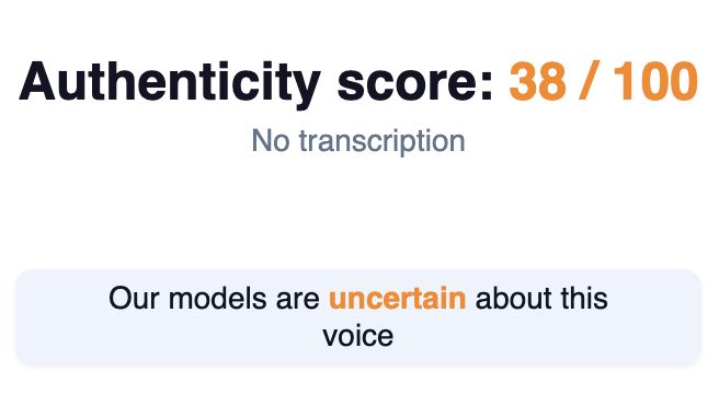 Para corroborar que efectivamente se hizo con con inteligencia artificial, Fast Check sometió el audio del viral a un análisis en la plataforma Hiya. En ella se detectó un 62% de probabilidades de haber sido generado sintéticamente.