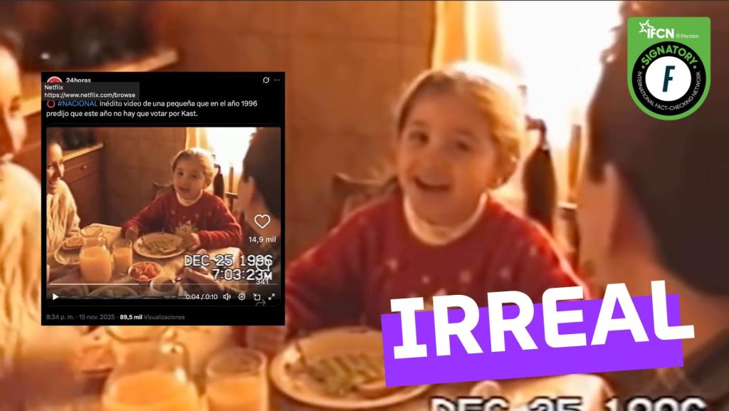 La imagen muestra a una niña comiendo junto a su padre y su madre y, en un momento, la menor dice: «No voten por Kast en 2025». Uno de los posteos señala en su descripción: «Inédito video de una pequeña que en el año 1996 predijo que este año no hay que votar por Kast».