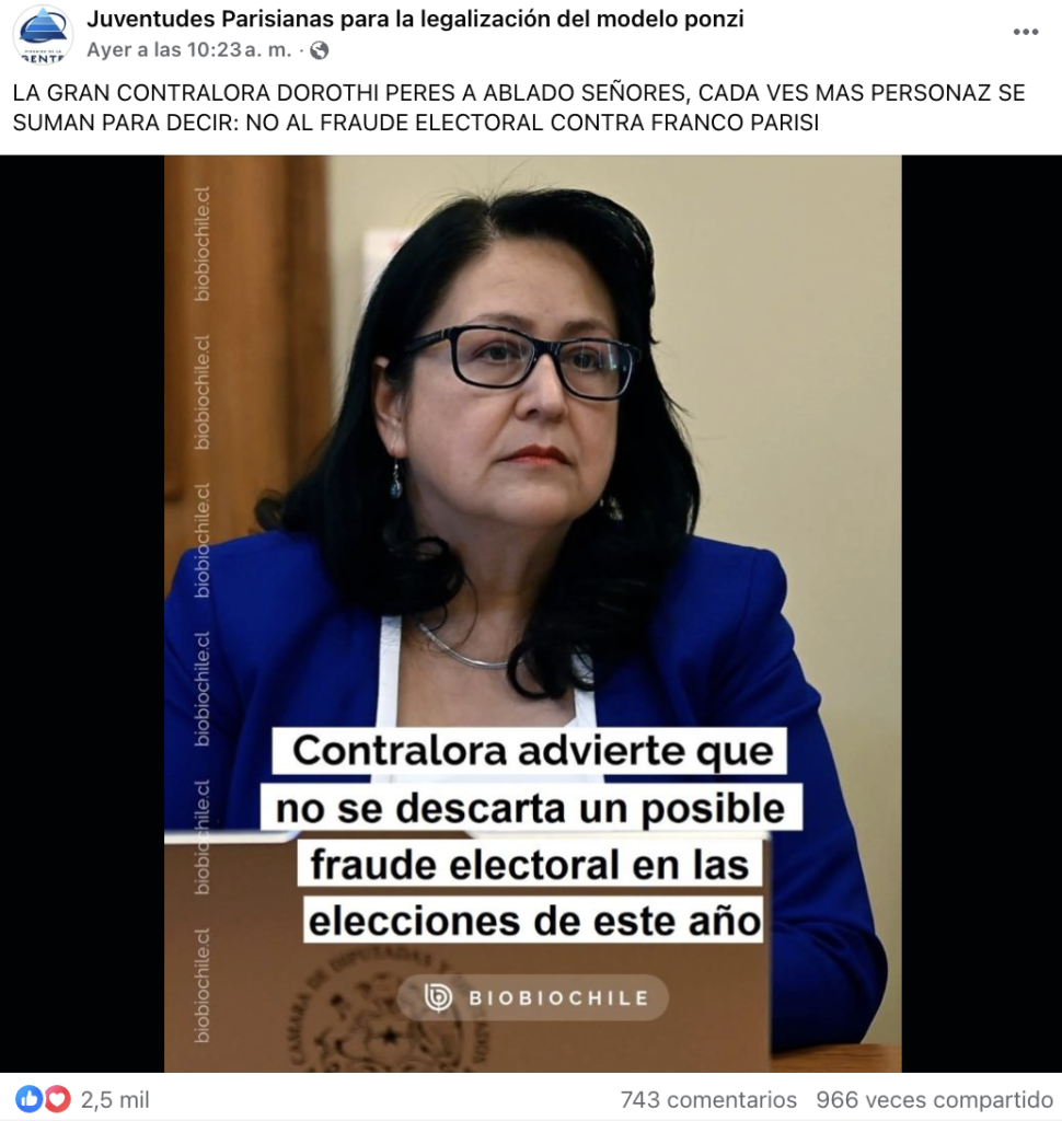 Durante este pasado lunes 17 circuló una gráfica de Radio Biobío con la imagen de la contralora Dorothy Pérez. El título anuncia que «Contralora advierte que no se descarta un posible fraude electoral en las elecciones de este año».