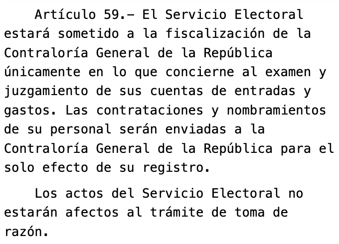 Es importante destacar que el Decreto con Fuerza de Ley 5, en su artículo 59, establece que el Servel está sometido a Contraloría solo para «examen y juzgamiento de sus cuentas de entradas y gastos». Explícitamente se menciona: