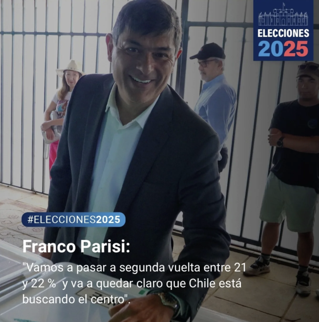 Jeannette Jara (PC) y José Antonio Kast (PREP) lograron pasar a la segunda vuelta de la elección presidencial tras lograr el 26,85% y el 23,92% de las preferencias, respectivamente. En tercer lugar quedó Franco Parisi (PDG), cuyo 19,71% ha generado especulación sobre el nivel de influencia que podría tener en el próximo balotaje