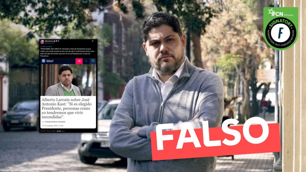 Fast Check CL catalogó este contenido como #Falso. No existe rastro alguno de un artículo donde Alberto Larraín emita la frase viralizada, ni en BioBioChile ni en ningún otro medio. Además, la revisión del sitio no arrojó ninguna noticia que coincidiera con la publicación difundida en redes. Finalmente, tanto el director de BioBioChile como el propio Alberto Larraín desmintieron la autenticidad de la imagen y la veracidad de la frase atribuida.