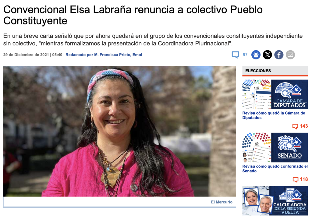 - Nota de EMOL: “Convencional Elsa Labraña renuncia a colectivo Pueblo Constituyente”.