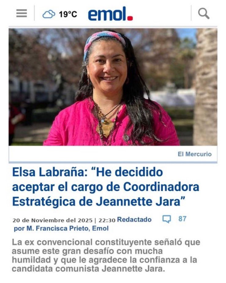 «Ante la información falsa que ha circulado en redes sociales, aclaramos que Elsa Labraña no forma parte del Comando de Jeannette Jara, ni como coordinadora de estrategia ni en ningún otro rol dentro de la estructura del comando. Cualquier afirmación en ese sentido es completamente incorrecta y no representa la realidad de nuestro equipo».