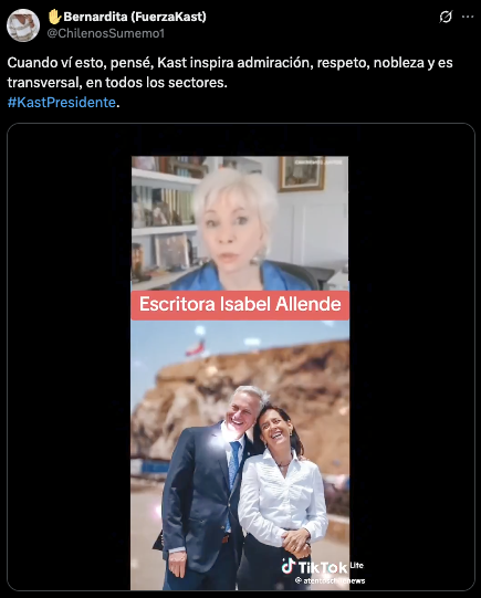 A través de X (1,2,3,4) y TikTok se comparte un video de la escritora Isabel Allende (sobrina del expresidente, Salvador Allende) supuestamente manifestando su respaldo a la candidatura de José Antonio Kast (Partido Republicano).