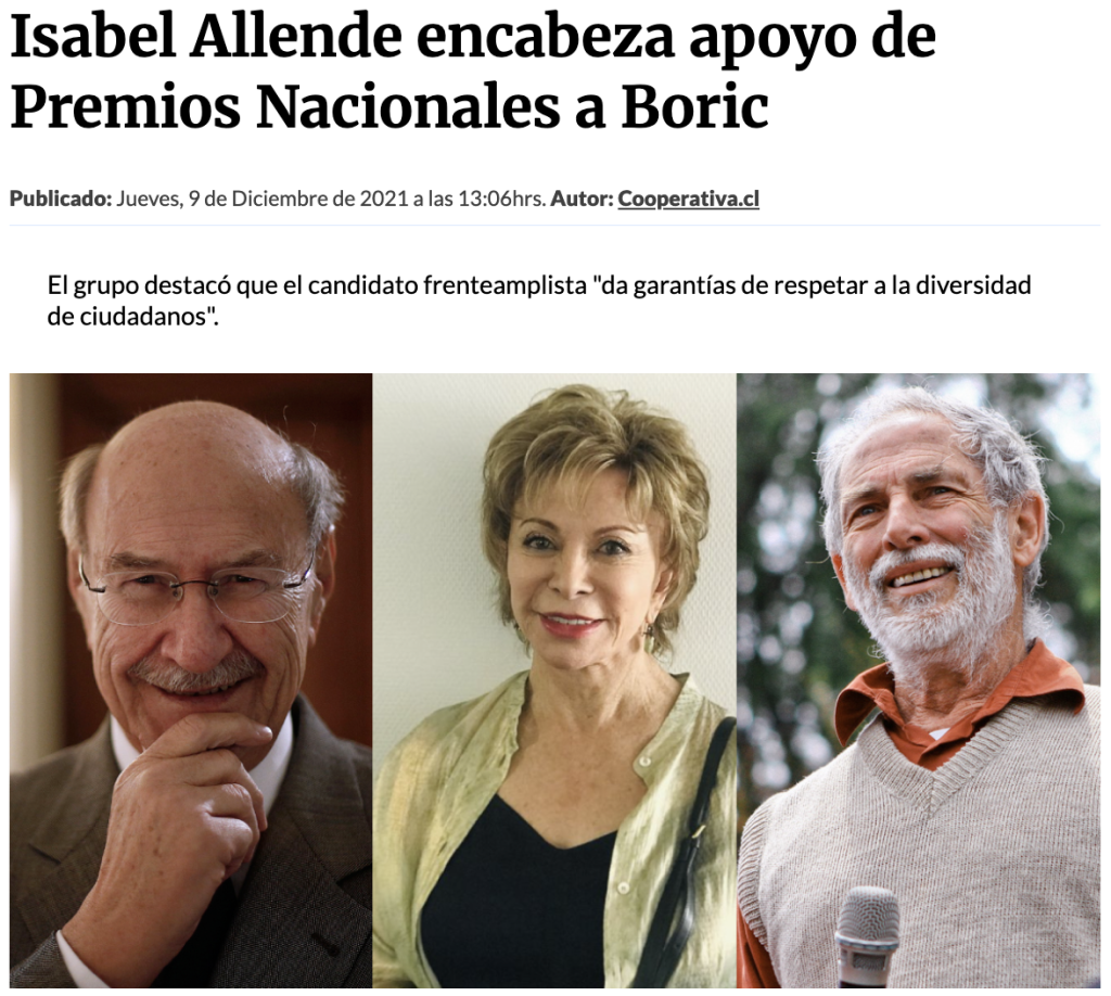 - Nota de Cooperativa: Isabel Allende encabeza apoyo de Premios Nacionales a Boric