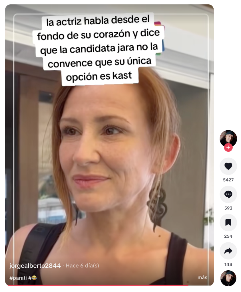 El supuesto respaldo acumula más de 192 mil visitas en la plataforma. Sin embargo, Fast Check CL califica este contenido como #Falso. No hay registros de que la actriz haya apoyado al republicano y su actividad política señala un visión contraria a la del candidato.