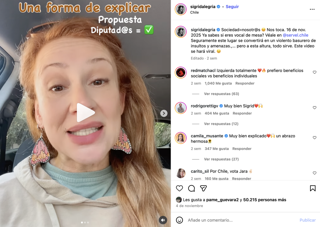 Un examen a sus cuentas de X e Instagram no muestra ningún cambio en esa opción política. La primera se mantiene inactiva desde 2022, y la segunda tiene una publicación reciente acerca de las elecciones parlamentarias y presidenciales de 2025. Sin embargo, Alegría no respalda explícitamente a ningún candidato en el registro.
