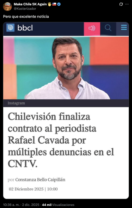 A raíz de esto, se compartió este martes 2 de diciembre una supuesta noticia de Bíobío, cuyo título asegura que «Chilevisión finaliza contrato al periodista Rafael Cavada por múltiples denuncias en el CNTV». En menos de tres horas, el post acumula más de 50 mil visualizaciones.