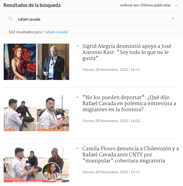 Se procedió a buscar directamente en el sitio web de Biobío y tampoco se encontró ninguna noticia al respecto. Los resultados con su nombre arrojaron notas sobre el hecho ya comentado, es decir, del momento en que Cavada le asegura a los inmigrantes que no los pueden deportar, y de la denuncia de Camila Flores. Nada sobre una desvinculación de parte de Chilevisión.