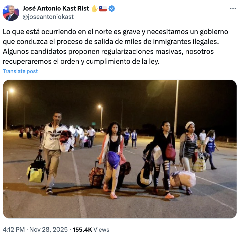 Así las cosas, José Antonio Kast compartió en X la imagen de unos migrantes caminando por la calle que supuestamente se habría tomado en dicho contexto. Al respecto, comentó: