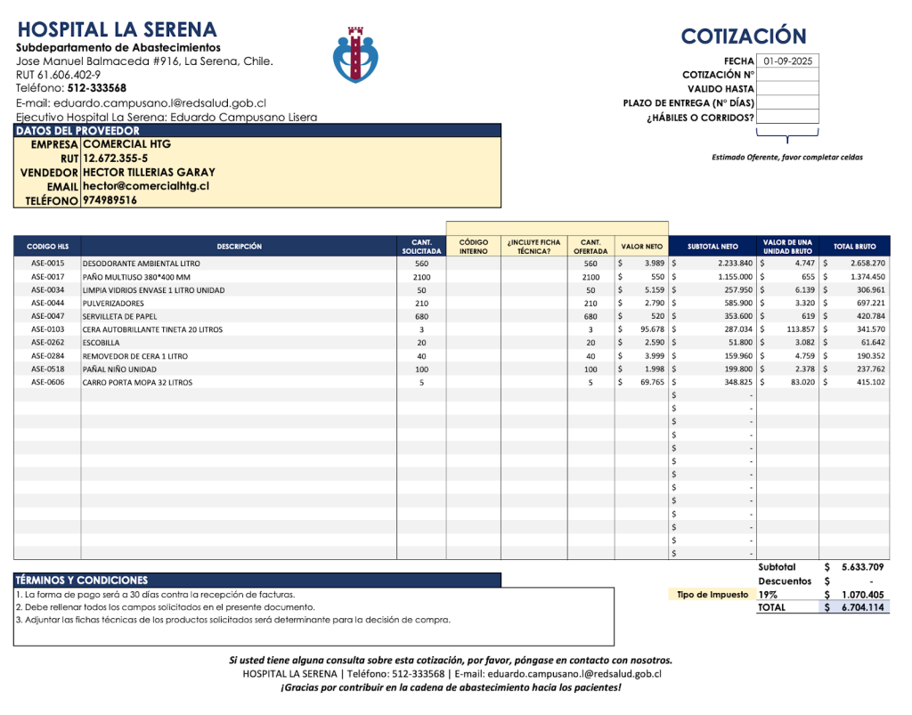 ¿Y en los Tratos Directos? El escrito expone «ejemplos representativos», entre ellos una compra realizada por esta vía. En ese caso, la resolución de adjudicación indica que la oferta más económica correspondía a una de las empresas cuestionadas. Sin embargo, precisa que las cotizaciones fueron «elaboradas en formato interno del Hospital de La Serena» por el propio Eduardo Campusano, sin adjuntar las cotizaciones reales, lo que impide verificar la autenticidad de las propuestas.