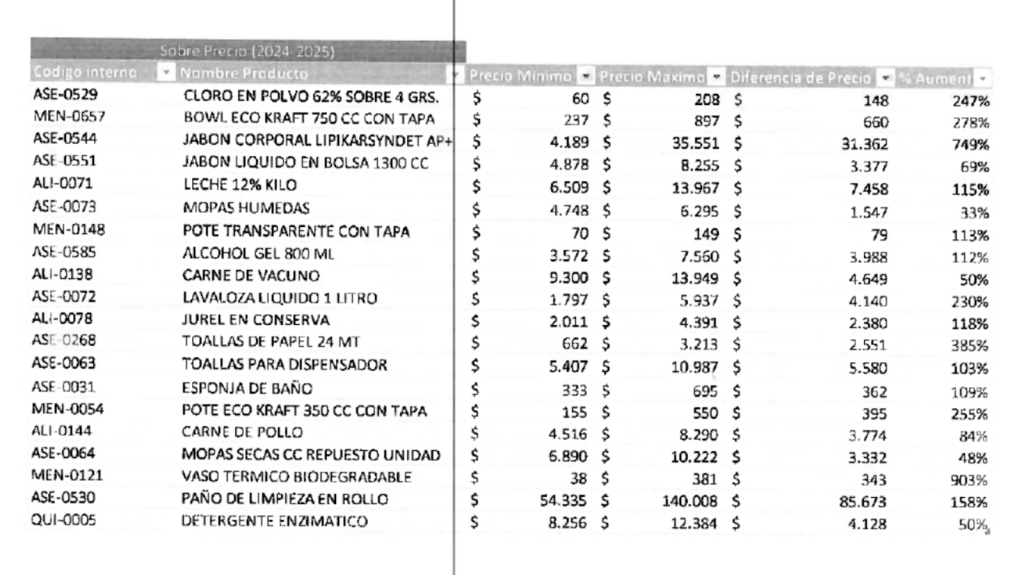 Seguidamente, el documento analiza la variación de precios de distintos productos entre 2024 y 2025 a modo de prueba de los sobreprecios presentados por ambos proveedores. De esta manera, se observó que el producto «paño de limpieza en rollo» varió de un precio mínimo de $54.335 a uno máximo que llegó a $140.008, es decir tuvo un cambio de 158%.