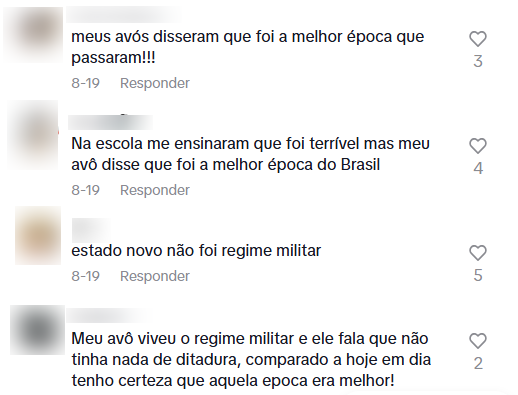Hay, incluso, una cuenta brasileña dedicada exclusivamente a la dictadura militar en el País. El perfil en TikTok se refiere al período como “régimen militar” y acumula más de 34 mil seguidores y 424 mil ‘me gusta’. Solamente diez videos relevados por el reportaje suman más de 2 millones de visualizaciones.