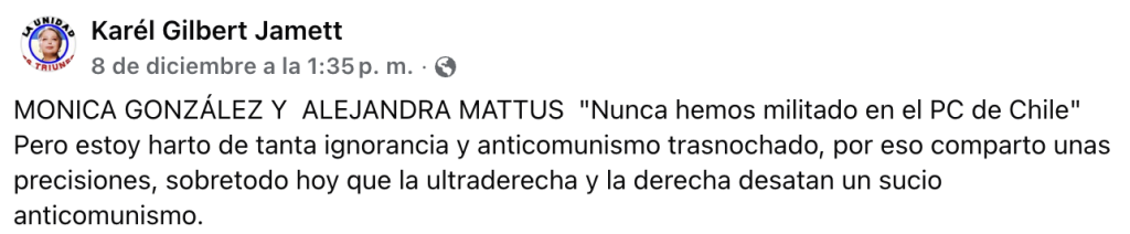 Fast Check CL califica este contenido viral como #Falso. No hay registros de prensa nacional que corroboren que las galardonadas periodistas, Mónica González y Alejandra Matus, hayan escrito una columna que acusa a «la ultraderecha y la derecha» de desatar «un sucio anticomunismo». Además, ambas profesionales desmintieron ser autoras del escrito en diálogo con esta redacción.