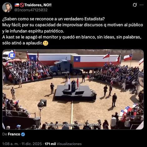 Publicaciones en X (1,2,3) comparten un video de José Antonio Kast donde, luego de que se apague su teleprompter, reconoce que no sabe el discurso completo y procede a quedarse en silencio durante varios segundos. A lo largo del registro, el republicano dice: