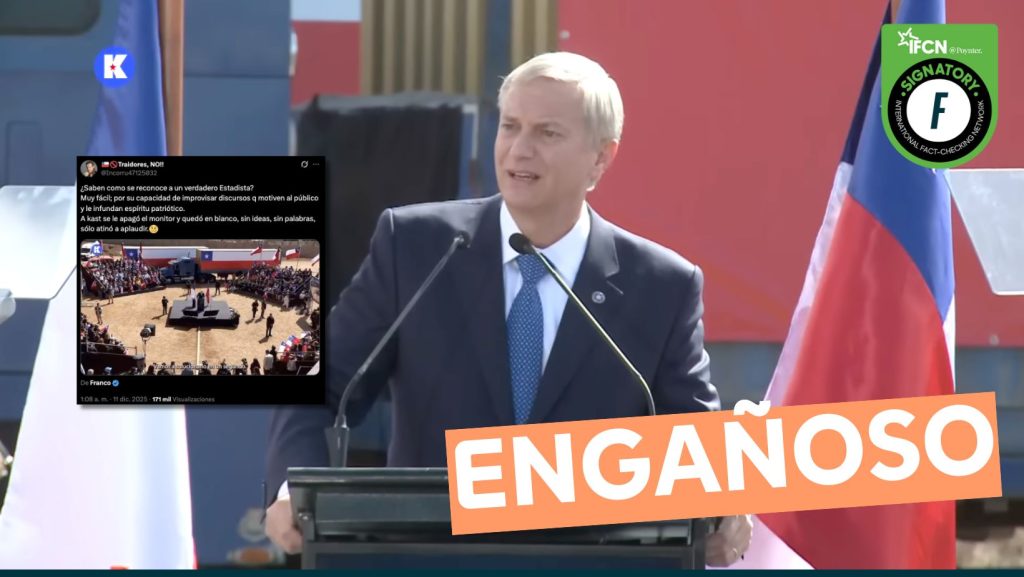 Fast Check CL calificó el contenido como #Engañoso. Tras revisar la transmisión original, se verificó que el video viral fue elaborado mediante la unión de distintos fragmentos editados, prolongando artificialmente los silencios para instalar la idea de que José Antonio Kast permaneció callado durante varios segundos. Asimismo, se incorporó un ruido de viento para suprimir el audio del público, que en diversos momentos del acto estuvo cantando y aplaudiendo.