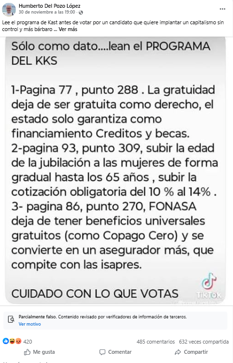 Fast Check CL califica este contenido como #Engañoso. Aunque la imagen difundida en redes, que alude a cambios en políticas sociales, corresponde efectivamente al programa de José Antonio Kast, no pertenece a la propuesta del año 2025, sino al de su campaña en 2021. El contenido, por tanto, fue sacado de contexto.