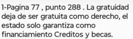 La fotografía chequeada postula que la supuesta página 77, punto 288 dice: «La gratuidad deja de ser gratuita como derecho, el estado solo garantiza como financiamiento créditos y becas».