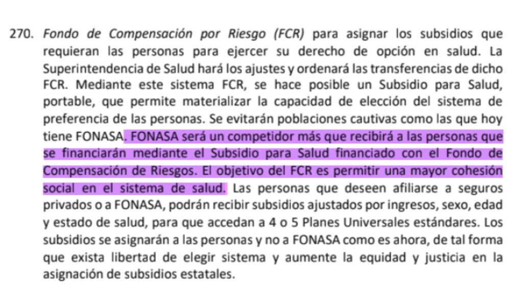 La búsqueda de la palabra «FONASA» en el texto del programa 2021 se repite en 14 ocasiones. Efectivamente, el punto 270 (programa 2021), página 87, implica al Fondo de Salud Pública como un competidor más entre las Isapres.