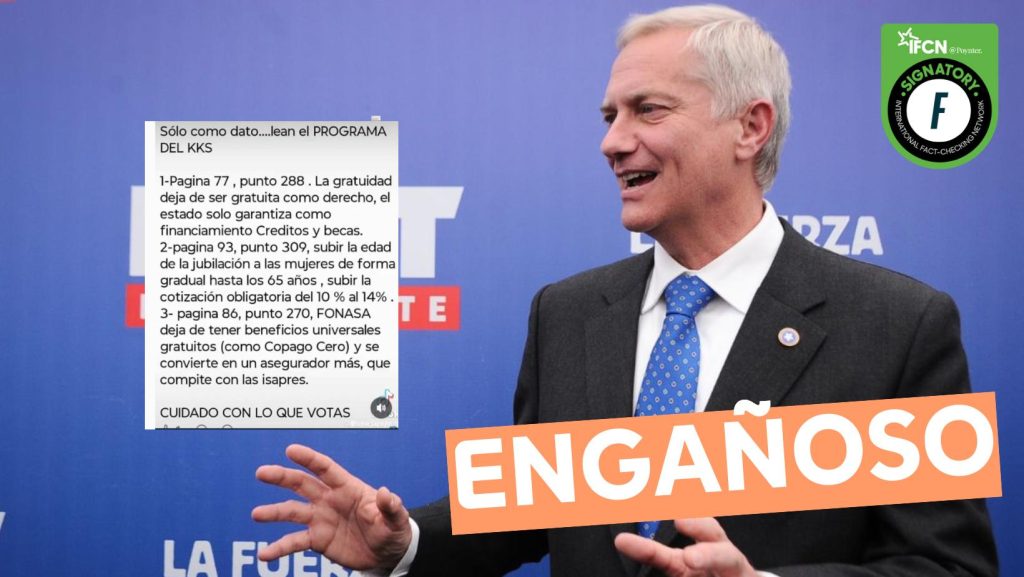 Fast Check CL califica este contenido como #Engañoso. Aunque la imagen difundida en redes, que alude a cambios en políticas sociales, corresponde efectivamente al programa de José Antonio Kast, no pertenece a la propuesta del año 2025, sino al de su campaña en 2021. El contenido, por tanto, fue sacado de contexto.