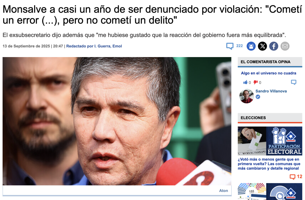 - Nota de Emol: “Monsalve a casi un año de ser denunciado por violación: ‘Cometí un error (…), pero no cometí un delito'”