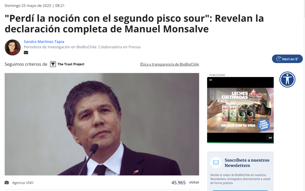 - Nota de Bio Bio Chile: “‘Perdí la noción con el segundo pisco sour’: Revelan la declaración completa de Manuel Monsalve”