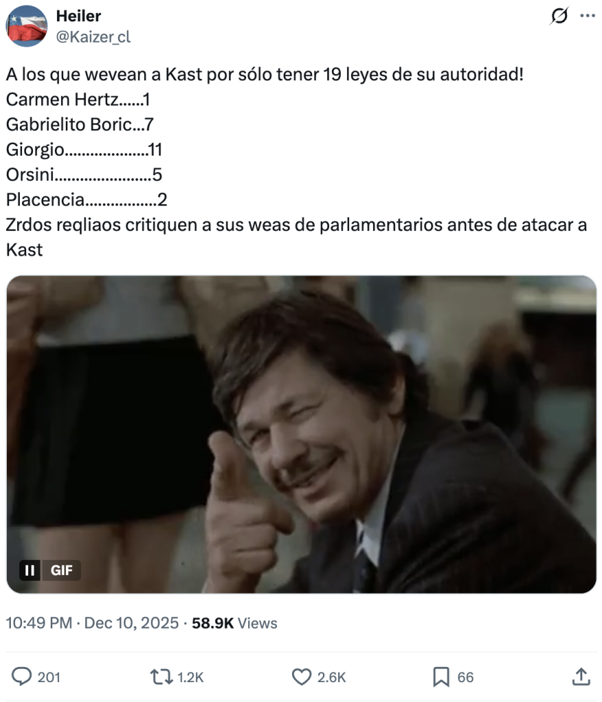 En ese contexto, el 10 de diciembre comenzó a circular una publicación en la red social X —con más de 58 mil visualizaciones— que exponía la supuesta cantidad de proyectos de ley aprobados por Gabriel Boric y Giorgio Jackson durante su paso por la Cámara de Diputados, así como por Maite Orsini, Carmen Hertz y Alejandra Placencia, actuales parlamentarias del oficialismo.