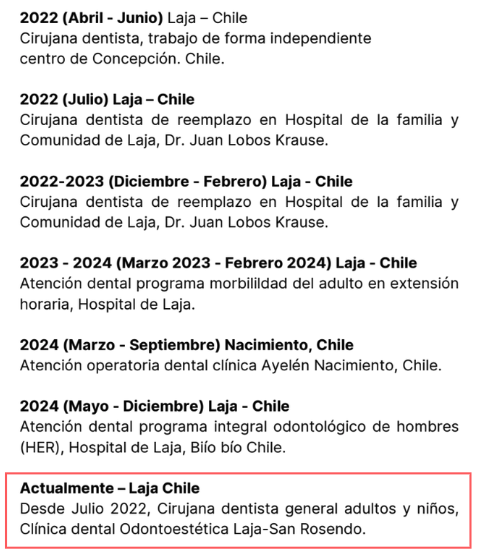 A partir de ello, Fast Check CL revisó los antecedentes del proceso licitatorio disponibles en la plataforma Mercado Público e identificó a Darling Vásquez Anabalón como la profesional que se adjudicó la mayor parte de las líneas correspondientes a prestaciones odontológicas. En ese contexto, se accedió a su currículum, donde la cirujana dentista consignó que —al momento de la licitación— trabajaba desde 2022 en la «Clínica Dental Odontoestética Laja–San Rosendo».