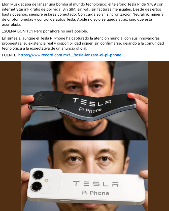 En redes sociales (1,2,3) circula contenido que atribuye a Elon Musk el supuesto desarrollo de un nuevo dispositivo: el Tesla Pi Phone. Según estas publicaciones, el teléfono tendría un precio estimado de 789 dólares, ofreciendo prestaciones que superarían a las de otros equipos del mercado, como acceso gratuito a internet mediante Starlink, carga integrada y un sistema de seguridad avanzado.