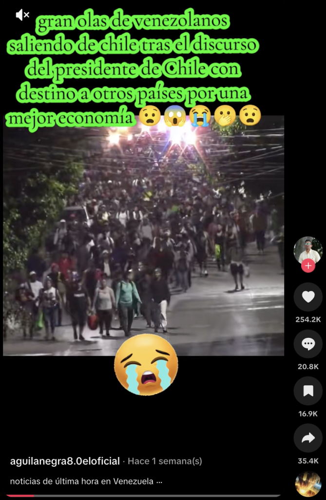 Durante los últimos días un nuevo video (1,2) se viralizó con la misma información, acumulando más de 250 mil likes en TikTok y 13 millones de visualizaciones. «Gran ola de venezolanos saliendo de Chile tras el discurso del presidente de Chile con destino a otros países por una mejor economía», se asegura.