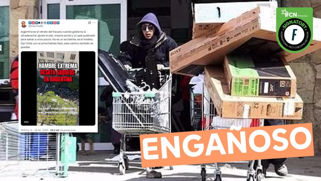 Fast Check CL califica este contenido como #Engañoso. Si bien Meganoticias informó de una «ola de saqueos» en Argentina, el registro es de agosto de 2023. El video fue recortado para suprimir el contexto en el que se difundió: la antesala de los comicios presidenciales del país trasandino, los cuales se llevaron a cabo el 22 de octubre de 2023.