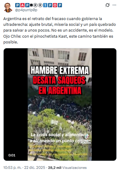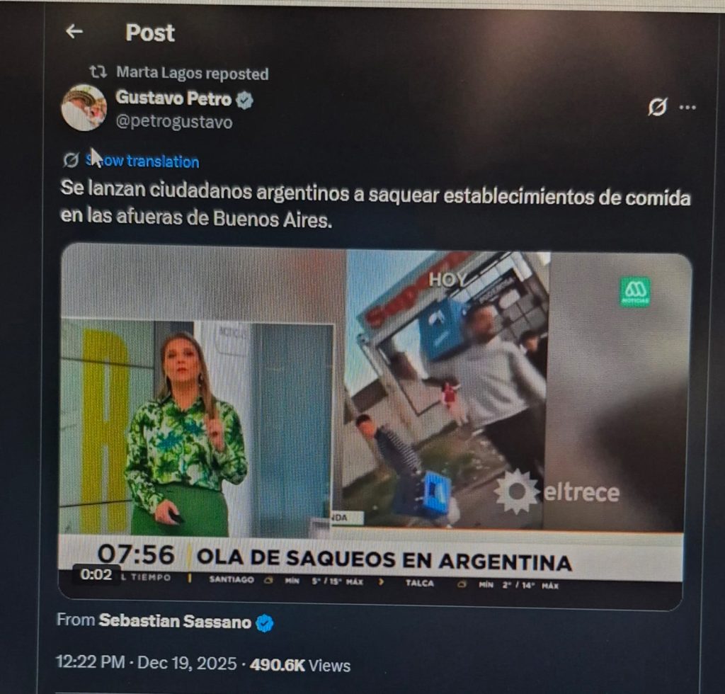 A través de X, incluso, fue compartido por el presidente de Colombia, Gustavo Petro, asegurando –en una publicación borrada–, que se ve cómo «se lanzan ciudadanos argentinos a saquear establecimientos de comida en las afueras de Buenos Aires».
