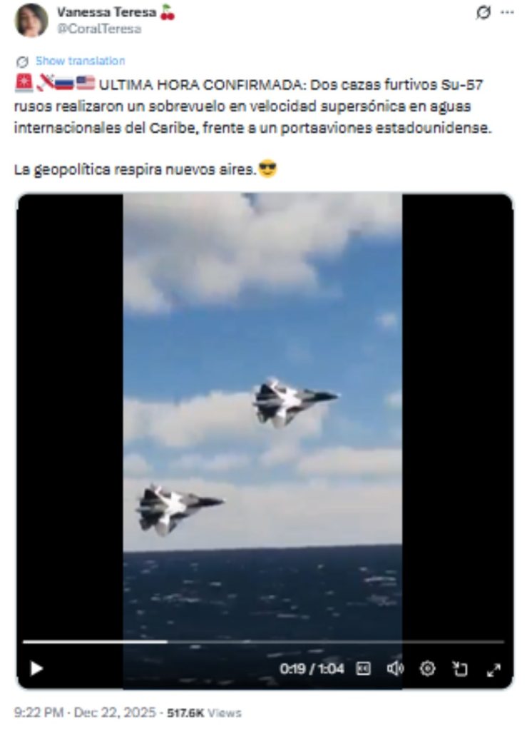 Según la publicación, el registro daría cuenta de una acción coordinada entre Rusia y Venezuela en respuesta a las presiones ejercidas por Washington contra el gobierno de Nicolás Maduro: «Dos cazas furtivos Su-57 rusos realizaron un sobrevuelo en velocidad supersónica en aguas internacionales del Caribe, frente a un portaaviones estadounidense» describe el post verificado.