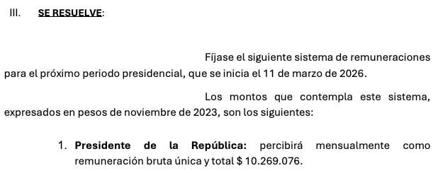 La Comisión para la Fijación de Remuneraciones estableció en 2024 que —independientemente de quien resultara electo presidente—, a contar de marzo de 2026, el sueldo del próximo mandatario ascendería a $10.269.076 pesos. Según la resolución N°5 de la comisión, este monto está expresado en pesos de noviembre de 2023. Reajustado en base al IPC, aumenta a $11.070.064 pesos, aproximadamente.
